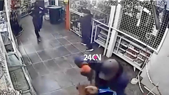 Una cámara interna del local mostró como un delincuente, que llevaba puesta ropa de la policía, se abalanza sobre un hombre y le pega un culatazo. Detrás, ingresaron los otros tres -todos a cara tapada- que se dividieron para vaciar la caja y controlar a las víctimas.