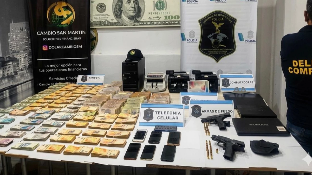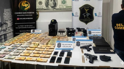 En total secuestraron cinco máquinas de contar billetes, 1 DVR, 4 Computadoras portátiles, $110.000 de dólares, $100.338.000 pesos, 9025 euros y 1700 reales. A su vez, encontraron 2 armas de fuego tipo pistolas calibre 9 mm con cargador y municiones intactas.