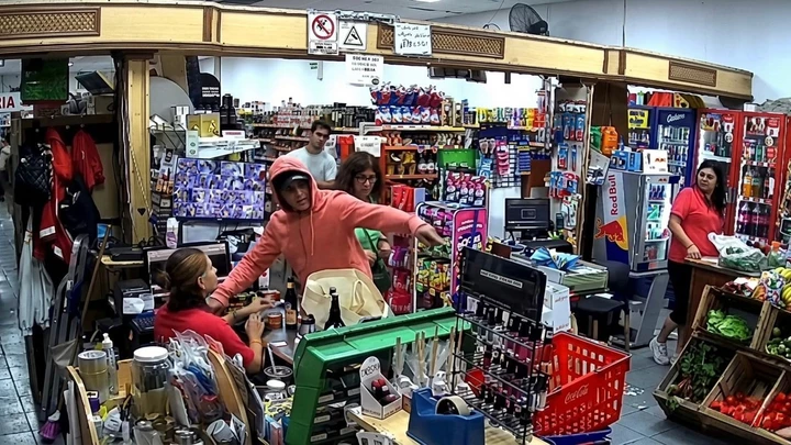 Las imágenes registraron además las escenas de tensión que se vivieron dentro del supermercado: una clienta que estaba por pagar se apartó rápidamente y resguardó sus pertenencias, mientras que un hombre tomó a su hijo y se refugió en el fondo del local junto a otros clientes, que buscaron protegerse entre las góndolas.