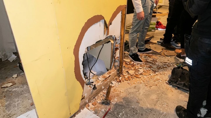 El boquete había sido hecho a ras del piso con una dimensión suficiente para permitir el paso de los efectivos policiales. Una vez en el interior, los oficiales descubrieron y detuvieron al tercer involucrado en medio de un desorden generalizado.