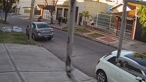 Las cámaras de seguridad del lugar capturaron el instante preciso en el que el damnificado, que intentaba estacionar su vehículo, es asaltado por dos delincuentes a punta de pistola a plena luz del día.