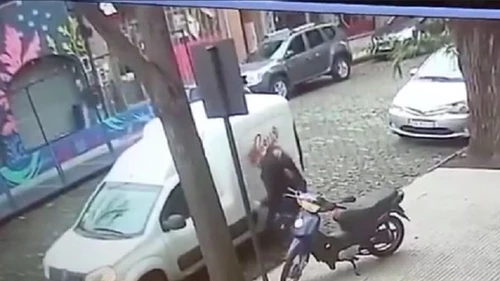 El primero de ellos fue registrado por una cámara de seguridad donde se observa cuando el repartidor comienza a sentir ruidos extraños en el chasis de su camioneta, la cual estaba estacionada en la calle Chacabuco al 400.