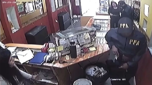 Los ladrones entraron a la joyería vestidos con camperas azules y gorras con las siglas de la Policía Federal Argentina (PFA) y tenían un papel en sus manos para simular un operativo.