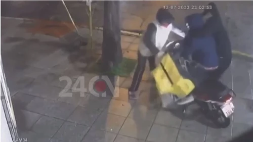 Según se observa en las imágenes, el delivery le entregó el pedido a un cliente y se subió a la moto para irse. En ese momento fue sorprendido por dos ladrones que lo atacaron por la espalda, lo tomaron del cuello mientras lo amenazaban con un cuchillo y lo bajaron a golpes de la moto.