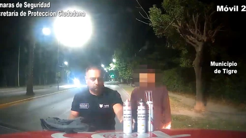 El detenido había graffiteado la entrada de un negocio ubicado en Avenida Benavídez y Tucumán. Las cámaras de seguridad captaron toda la situación y dieron aviso a la policía, que lo sorprendió in fraganti con las latas y una mochila que llevaba para guardarlas.