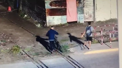 En las imágenes se ve cómo el joven camina con la bicicleta en la mano y cuando comienza a cruzar las vías del tren es sorprendido por un menor que le roba el rodado y escapa hacia un asentamiento.