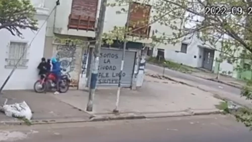 En las imágenes se ve cómo un motochorro sorprende a un menor de 15 años, lo arrincona contra la pared y en pocos segundos le roba la mochila y el celular.
