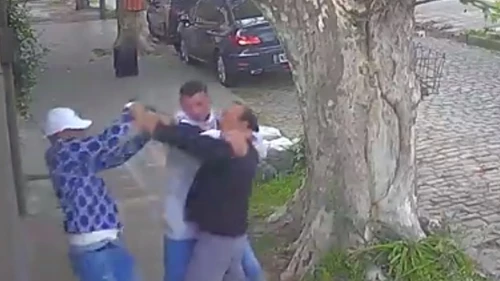En las imágenes se observa cuando la víctima estaciona y desciende de su auto con una valija y un saco en la mano. En ese momento es sorprendido por dos delincuentes armados que se le abalanzan, pero el hombre se resiste y se agarran a trompadas en la vereda.