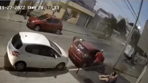 El hecho ocurrió en San Lorenzo 1500, partido de Tres de Febrero, y quedó registrado por las cámaras de seguridad. En las imágenes se ve cómo tres ladrones armados sorprendieron a una mujer cuando se estaba bajando de su auto Toyota Etios y la tiraron al piso. Al escuchar gritos, una familiar salió a la vereda a auxiliar a la víctima y les apuntaron con un arma.