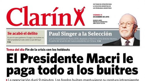 Con el título principal "El presidente Macri le paga todo a los buitres", el falso Clarín, que se distribuyó por sus militantes a fines de 2014 en calles de la Ciudad, anunciaba una breve negociación en el que "caería el empleo y el crecimiento, pero aumentaría la confianza en los buitres". Precisamente, Singer elogió a Macri en un artículo en la revista Time, en donde lo calificó como "el campeón de la reforma económica". La prestigiosa revista lo puso al líder del PRO como uno de los 100 líderes más influyentes del mundo.