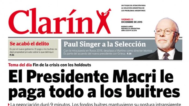 Con el título principal "El presidente Macri le paga todo a los buitres", el falso Clarín, que se distribuyó por sus militantes a fines de 2014 en calles de la Ciudad, anunciaba una breve negociación en el que "caería el empleo y el crecimiento, pero aumentaría la confianza en los buitres". Precisamente, Singer elogió a Macri en un artículo en la revista Time, en donde lo calificó como "el campeón de la reforma económica". La prestigiosa revista lo puso al líder del PRO como uno de los 100 líderes más influyentes del mundo.