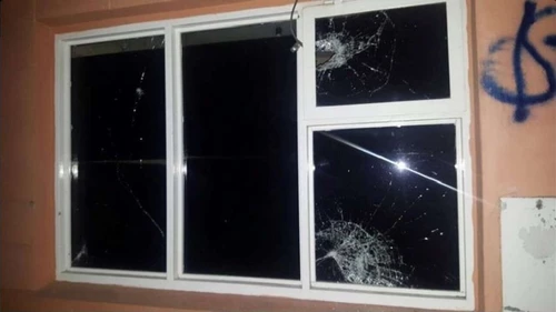 Las fotos muestran una puerta de hierro de ingreso rota, vidrios de una ventana destrozados y piedras de gran tamaño arrojadas en el patio.