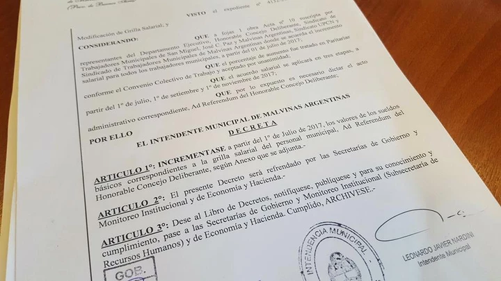 El jefe comunal dijo: "Logramos firmar un Convenio Colectivo de Trabajo histórico, porque fue con todos los gremios que representan a la totalidad de los trabajadores municipales. Se trata de un incremento en los haberes de un 22% promedio al 30 de junio en el municipio de Malvinas Argentinas".