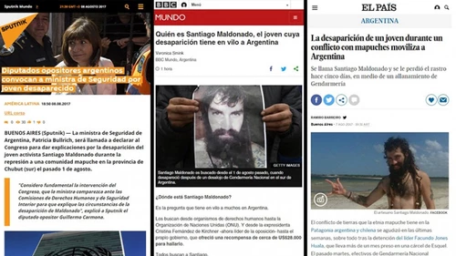 La BBC, El País, The Guardian y Sputnik se hicieron eco de la desaparición en Chubut de Santiago Maldonado durante un operativo de Gendarmería en un paraje de la comunidad mapuche. Apuntan contra el rol de la ministra de Seguridad PRO, que, a pesar de los testimonios, intentó desligar a fuerzas de seguridad y cargó contra los pueblos originarios.