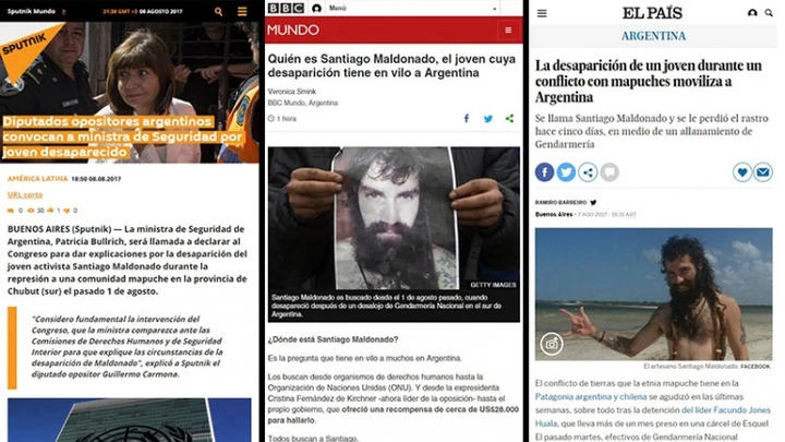 La BBC, El País, The Guardian y Sputnik se hicieron eco de la desaparición en Chubut de Santiago Maldonado durante un operativo de Gendarmería en un paraje de la comunidad mapuche. Apuntan contra el rol de la ministra de Seguridad PRO, que, a pesar de los testimonios, intentó desligar a fuerzas de seguridad y cargó contra los pueblos originarios.