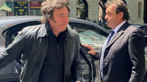 Detrás del presidente ingresaron al hotel Ambasciatori Karina Milei, -secretaria General de la Presidencia-, Manuel Adorni, legislador porteño electo, y el diputado nacional Fernando Iglesias.