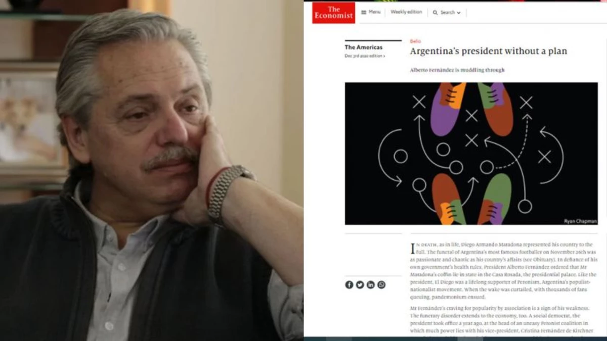 En una columna editorial de la sección "Americas", The Economist describe al Presidente como alguien que improvisa, débil, con ansia de popularidad y sin rumbo. La nota arranca haciendo hincapié en lo que Diego Armando Maradona representó, tanto mientras vivió como cuando se murió. "El funeral del futbolista más famoso de Argentina el 26 de noviembre fue tan apasionado y caótico como los asuntos de su país", indica.