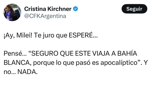 En este caso, el cuestionamiento tuvo que ver con la decisión del Presidente de no ir a Bahía Blanca tras el devastador temporal. "Pensé... ‘SEGURO QUE ESTE VIAJA A BAHÍA BLANCA, porque lo que pasó es apocalíptico'. Y no... NADA. ¡MADRE DE DIOS! ¡QUÉ DESCONEXIÓN EMOCIONAL TENÉS CON LOS QUE SUFREN!", posteó la líder del kirchnerismo en sus redes sociales.