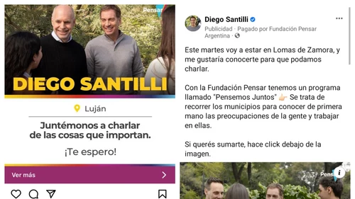 Y en las últimas horas el vínculo entre la fundación y la campaña de los dirigentes del PRO quedó más en evidencia. Una publicidad digital de la visita de Diego Santilli a Luján. "Este viernes voy a estar en Luján junto a Horacio Rodríguez Larreta y me gustaría conocerte para que podamos charlar", inicia el aviso que circuló por redes sociales entre los vecinos del distrito.