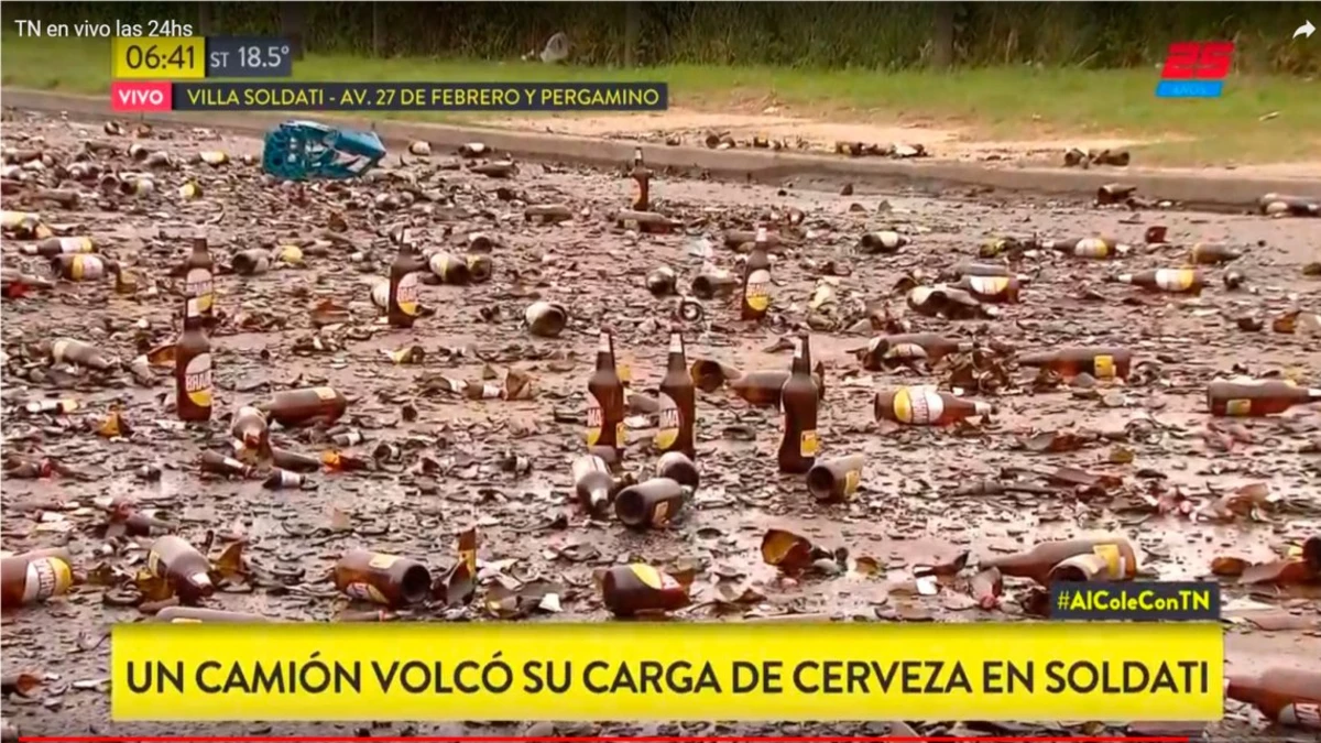 Dos vecinos aprovecharon el vuelco de un camión cargado con botellas de cerveza en Villa Soldati y se llevaron la bebida en un bidón. "Estábamos mirando el noticiero y vimos el accidente. Esto va para el freezer", aseguró uno de ellos a C5N.
