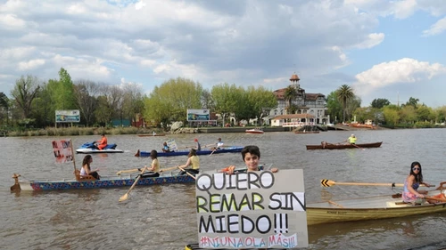 Milka Kraljev navega en su bote junto a su hijo de 7 años, quien lleva una remera bajo el lema “Ni una ola menos”, con la que hicieron la convocatoria. Ella es atleta de la selección argentina de remo: este año ganó la medalla de bronce en los Juegos Panamericanos y salió 7ma en el Mundial de Remo en Francia. “Fue una convocatoria autogestionada. Hasta pintamos nosotros las remeras con la consigna”, relató. “A veces entreno con miedo, porque vienen tan rápido algunas lanchas o motos que parece que se te vienen encima. El otro día tuve que parar para sacar agua del bote porque pasó una lancha rápido al lado mío”, agregó.