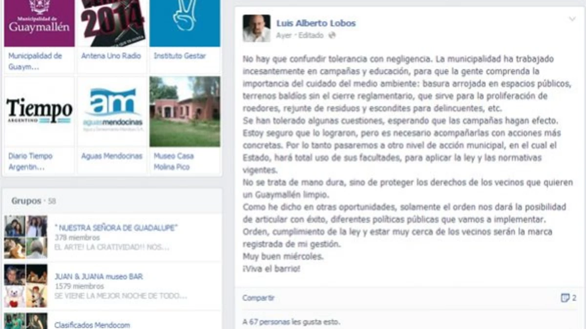 "Les pido a todos que me ayuden, poniendo en evidencia a quienes de alguna manera comercian, dañando no solamente la imagen de Guaymallén, sino la salud de los vecinos", se lee en la cuenta del intendente, https://www.facebook.com/luislobosgllen. "No se trata de mano dura, sino de proteger los derechos de los vecinos que quieren un Guaymallén limpio", dice el intendente, en uno de sus posteos.