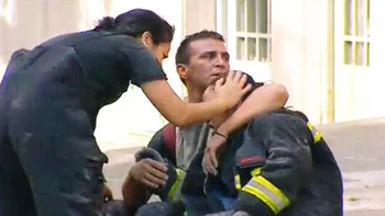 En medio de la confusión y la desesperación, una desgarradora imagen de compañerismo conmueve a todos. Se trata de dos bomberos que contienen a un colega herido e impactado por la magnitud del hecho.