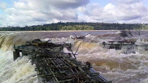 En esa circunstancia, comenzaron las tareas de rebatimiento de las pasarelas desmontables que se extienden por más de un kilómetro sobre el río Iguazú, para evitar su destrucción por resistencia a la fuerza del agua.