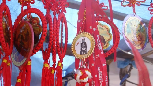 Jesús, María, los santos y estampitas de Francisco. San La Muerte, el Gauchito Gil, la cintita roja contra la envidia y hasta el gatito oriental de la fortuna, que mueve su bracito. Mientras haya espacio para la fe, también habrá espacio para los amuletos, “oficiales” o paganos, en las fiestas religiosas.
