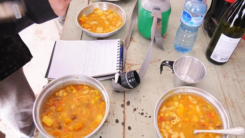 Al llegar cerca de las 18 al refugio Las Frías “Trincheras de Soler”, la cena lleva unas 12 horas de cocción. Claro, no es fácil preparar un menú para casi 200 personas. “Pelé una bolsa entera de zanahorias, una de cebollas, una de papas y algunas cosas más”, explica Sergio Ruarte, responsable de los estómagos contentos de esa jornada y quien confirma la inmejorable máxima de Ratattouile, a la cual adhiere de plano quien suscribe: “Cualquiera puede cocinar”. Es que Ruarte, en los papeles, no podría estar más lejos de la cocina: es Mecánico de Instalaciones y encargado de mantenimiento del Escuadrón de Gendarmería 26 Barreal. O sea, cocina porque le encanta y se da maña. Punto.