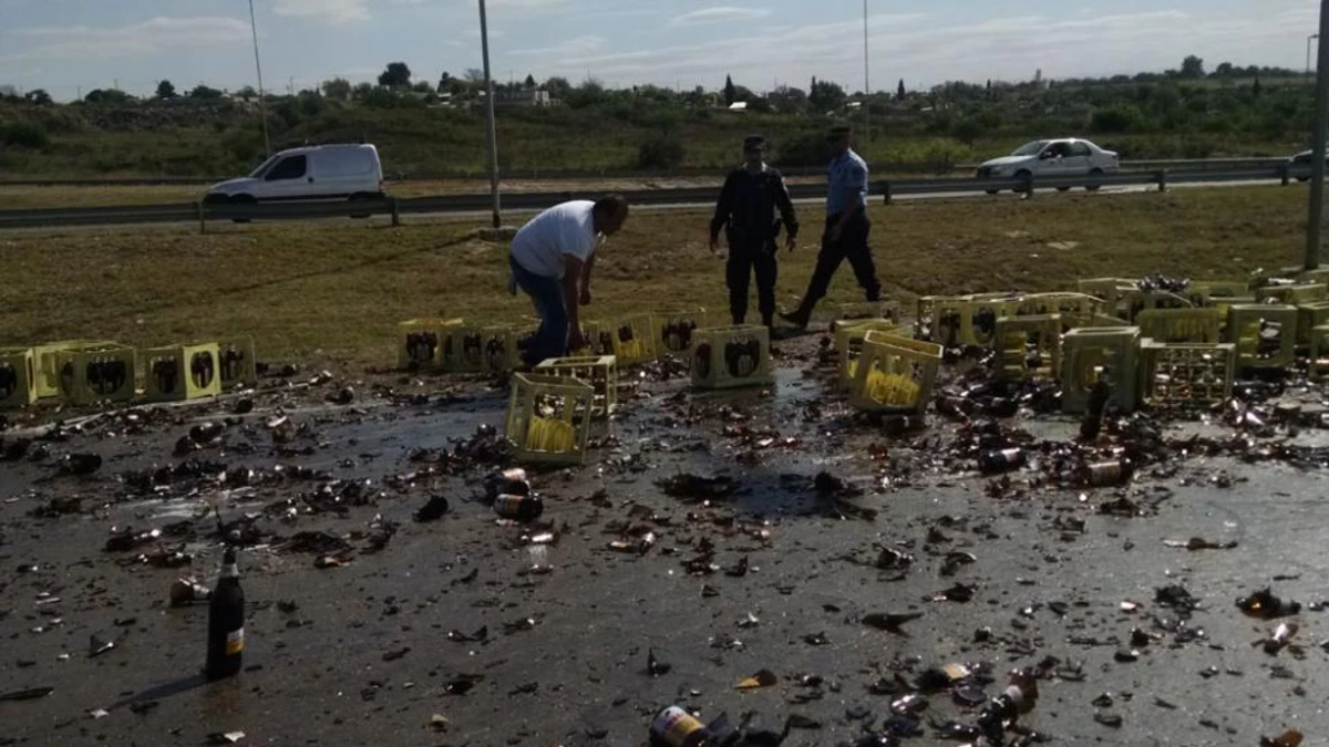 Se cayeron 30 cajones con botellas, según informó la Policía, y los restos de vidrios eran retirados de la calzada. En el lugar, trabajaba personal de Bomberos, la Policía y Caminos de las Sierras.