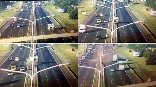 Las cámaras de seguridad captaron el momento en el que el camión atravesaba los carriles de derecha a izquierda y termina impactando contra el muro de contención.