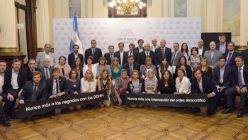 Tanto diputados del PRO como radicales posaron con dos afiches en el Congreso que ya generan rechazo.