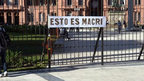 "Esto es Macri", se lee en el cartel que fue colgado este viernes en la reja de la Casa Rosada. La pigmentación de las letras doradas es obra de un artista que usó su propia materia fecal para lograr una tonalidad particular.