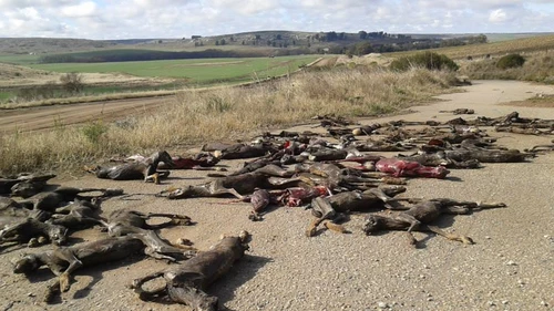 Sin cuero y con las marcas dejadas por su sangre, 60 zorros yacían al costado del camino. El dolor se manifestaba en la pose de los cuerpos, mostrando como algunos intentaron pararse o escapar después del ataque.